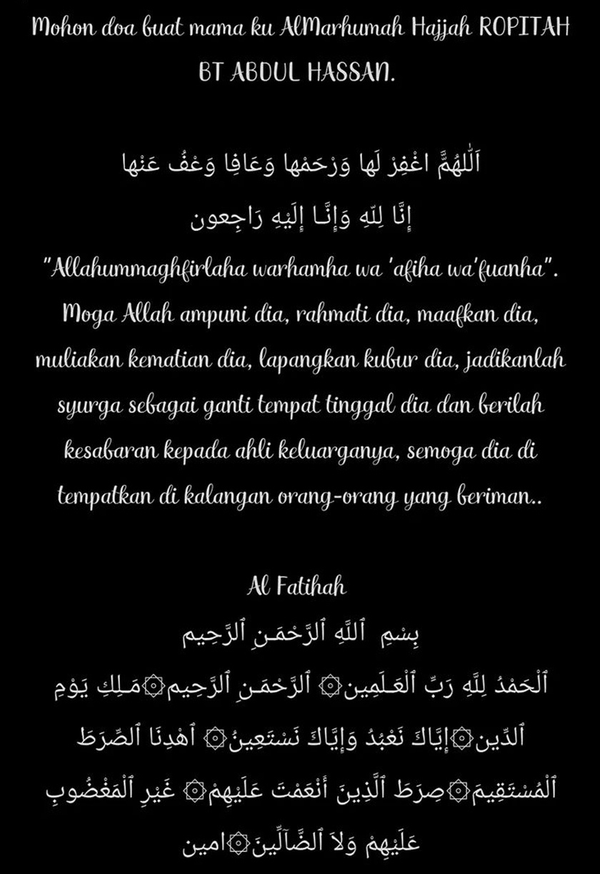 “Rindu. Hari ini genap seminggu pemergian mama (6 Syawal 1444, 1:13pm). AlMarhumah Hajjah Ropitah binti Robiah,” tulisnya pada Khamis.