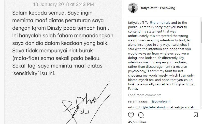 Permohonan maaf secara terbuka itu dilakukan oleh Fathia menerusi satu kenyataan di IGnya semalam.