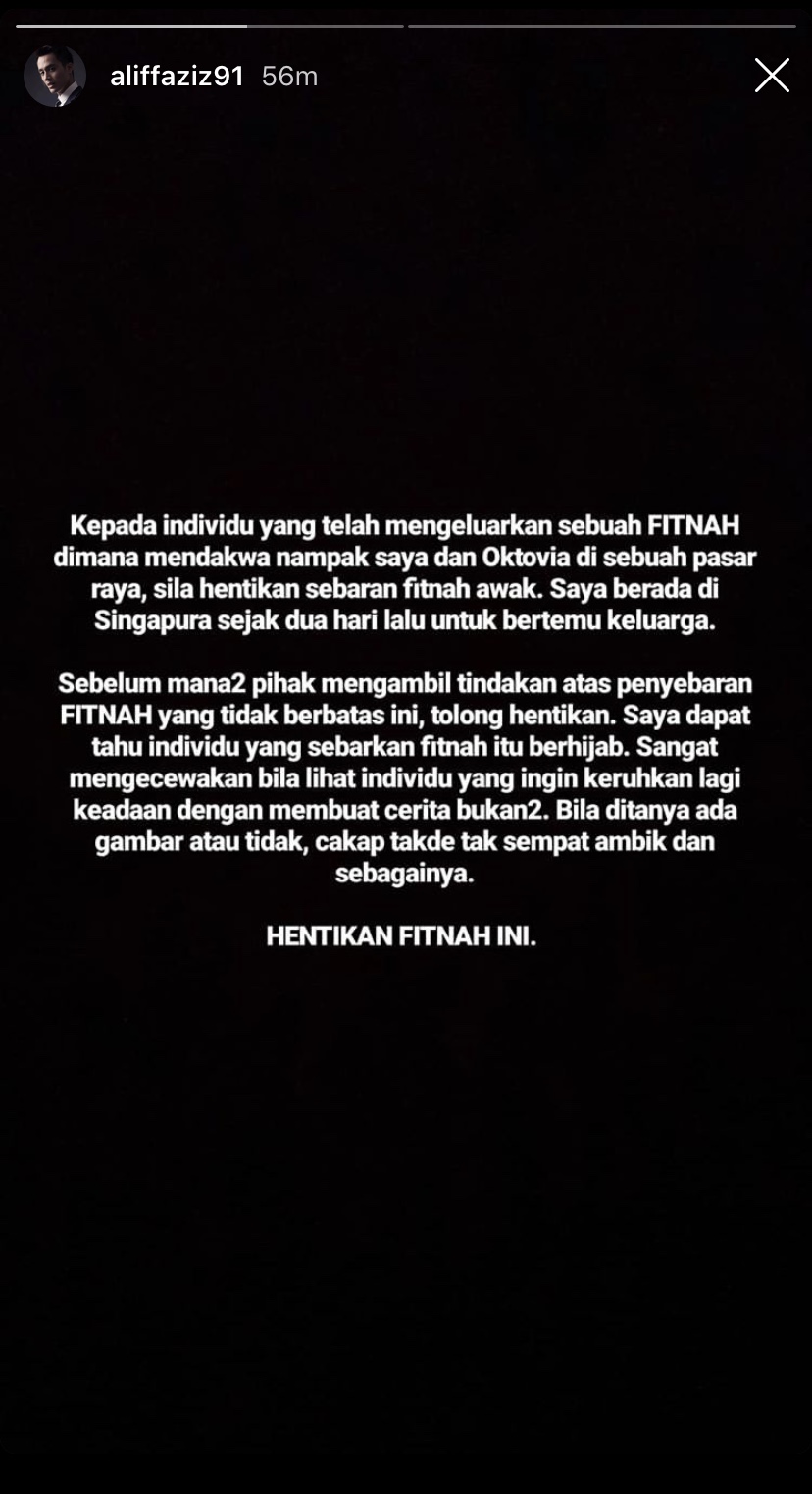 PENYANYI dan pelakon Aliff Aziz menafikan dakwaan kononnya kelihatan dirinya bersama aktres Octovia Manrose di sebuah pasar raya oleh seorang individu yang dikenali Sara Samsudin.