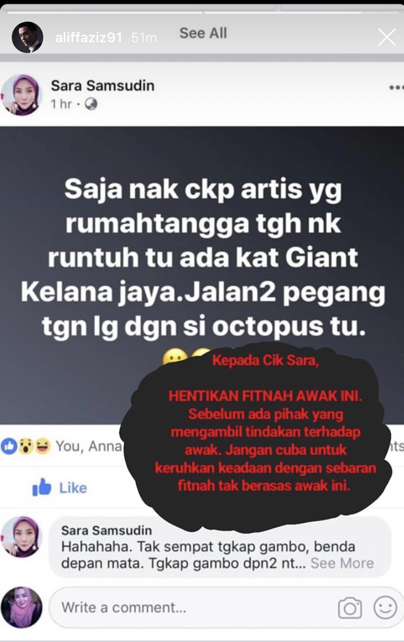 Aliff menegaskan kepada individu tersebut untuk berhenti menyebarkan fitnah sebelum terdapat pihak yang mengambil tindakan terhadap dirinya.