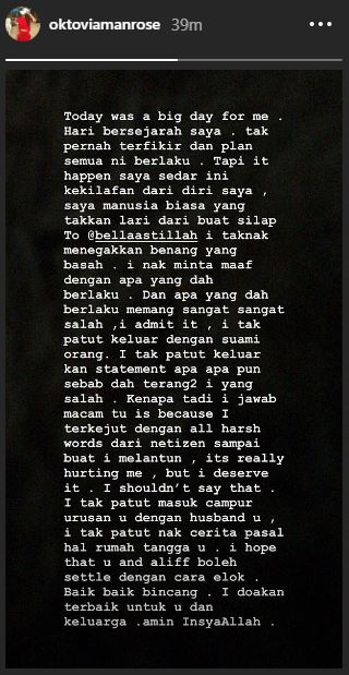 PELAKON baru, Oktovia Manrose tampil membuat permohonan maaf kepada Bella Astillah di ruangan Instastory berhubung kontroversi bersama suaminya, penyanyi, Aliff Aziz.