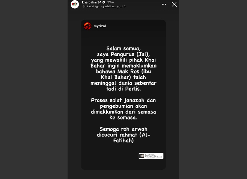 “Salam semua, saya Pengurus (Jai), yang mewakili pihak Khai Bahar ingin memaklumkan bahawa Mak Ros (ibu Khai Bahar) telah meninggal dunia sebentar tadi di Perlis.