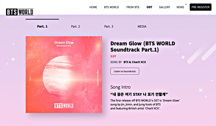 Bercakap mengenai soundtrack, lagu pertama ‘Dream Glow’ yang telah dimuat naik di permainan maya tersebut pada 7 Jun lalu didendangkan oleh Jin, Jimin dan Jungkook.