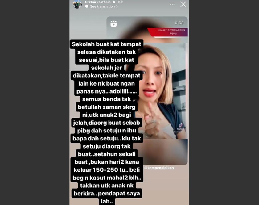 “Sekolah buat dekat tempat selesa dikatakan tak sesuai, bila buat dekat sekolah sahaja dikatakan tak ada tempat lain ke nak buat dengan panasnya. Adoi, semua benda tak betullah zaman sekarang ni,” tulisnya menerusi hantaran di Insta Story.