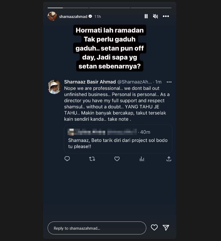 Sharnaaz kemudian menjawab, “Tidak, kerana kami profesional. Kami tidak akan tarik diri sehingga projek ini selesai. Personal is personal.”