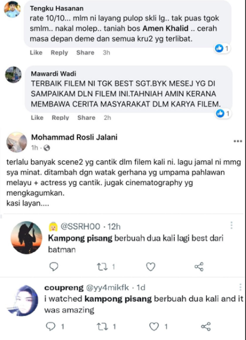 “Kepada mereka yang belum menonton, jangan lepaskan peluang untuk berhibur di samping meluangkan masa bersama insan tersayang di rumah dengan menonton filem ini.