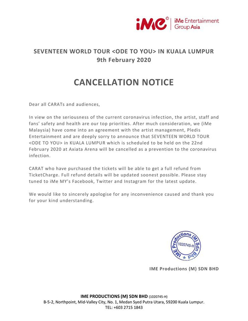 “Selepas membuat pertimbangan, kami mencapai persetujuan dengan pihak pengurusan artis, Pledis entertainment dan kami ingin mengumumkan bahawa konsert SEVENTEEN yang dijadualkan untuk berlangsung pada 22 Februari ini di Axiata Arena akan dibatalkan bagi mencegah jangkitan koronavirus,” kata iME dalam kenyataan rasmi tersebut.