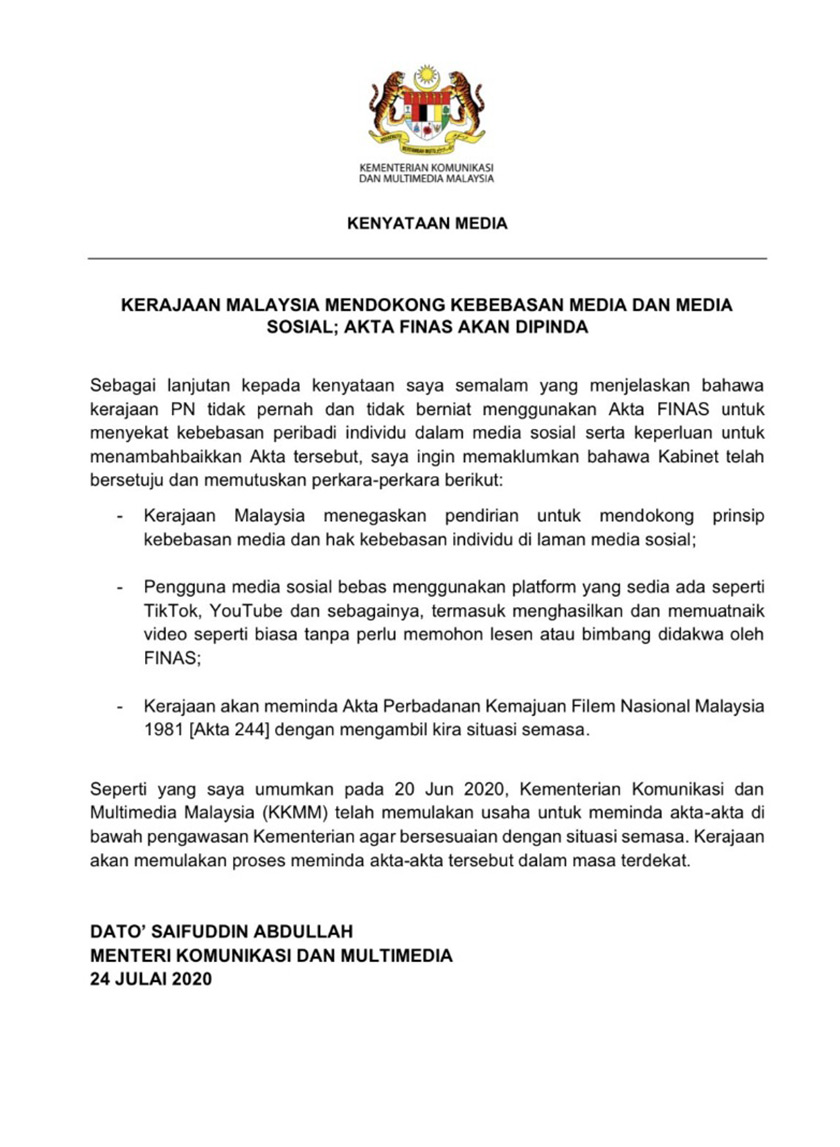 “Kerajaan Perikatan Nasional (PN) tidak pernah dan tidak berniat menggunakan Akta Perbadanan Kemajuan Filem Nasional Malaysia 1981 (Akta FINAS) [Akta 244] untuk menyekat kebebasan peribadi individu dalam media sosial,” katanya.