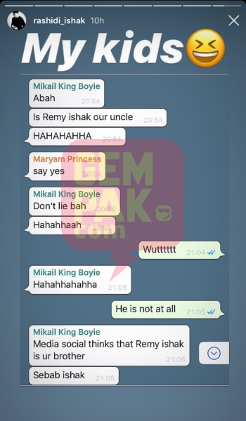 Rashidi mendedahkan perbualan anak-anaknya di sebuah aplikasi yang dilihat lucu kerana mereka berharap Remy adalah bapa saudara mereka.