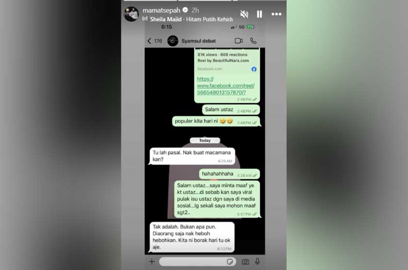 Permohonan maaf itu dikirimkan secara peribadi melalui WhatsApp dan kemudiannya dikongsikan oleh Mamat dalam bentuk tangkap layar di Instagram Story miliknya.