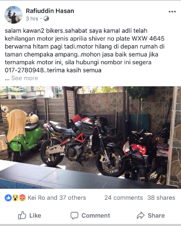 Menurut Rafiudin, motor berwarna hitam bernombor plat WXW 4645 itu dipercayai hilang di kediaman mereka, di Taman Cempaka, Ampang.