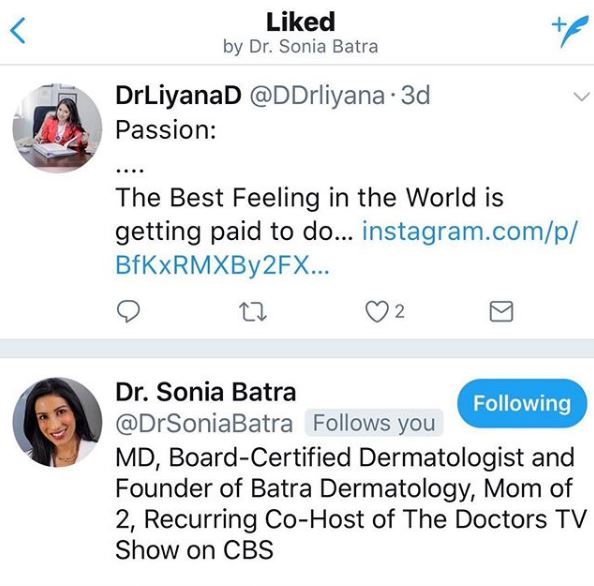 5) Baru berjinak-jinak dengan media sosial. Baru-baru ini juga Dr Liyana teruja apabila hos rancangan The Doctors Amerika Syarikat Dr. Sonia Batra menjadi pengikutnya di Twitter.