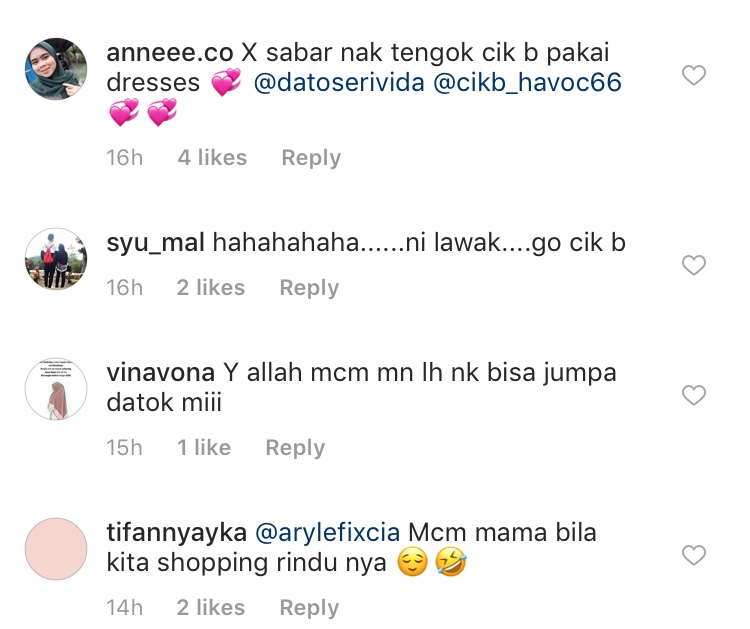 DSV memuat naik video tersebut di laman Instagram miliknya, @datoserivida bersama kapsyen: “Nak girl girl-kan Cik B. Haha.”