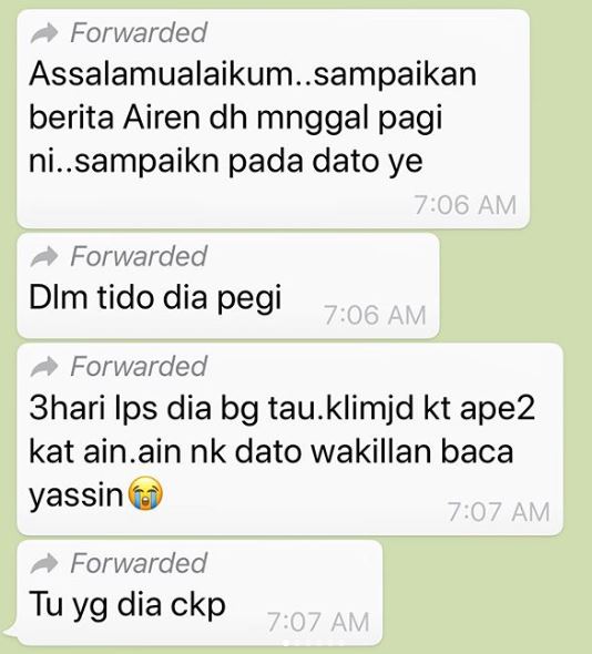 Difahamkan, Airen telah menghembuskan nafas terakhir ketika sedang tidur.