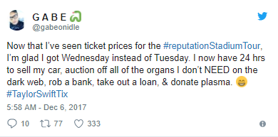 Peminat setia Taylor Swift itu menerusi akaun Twitternya memberitahu dia sanggup buat apa sahaja termasuk menjual kereta dan membuat pinjaman bank untuk membeli tiket konsert tersebut.