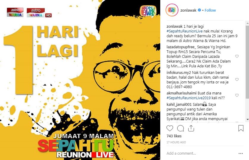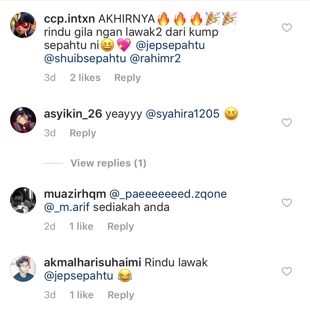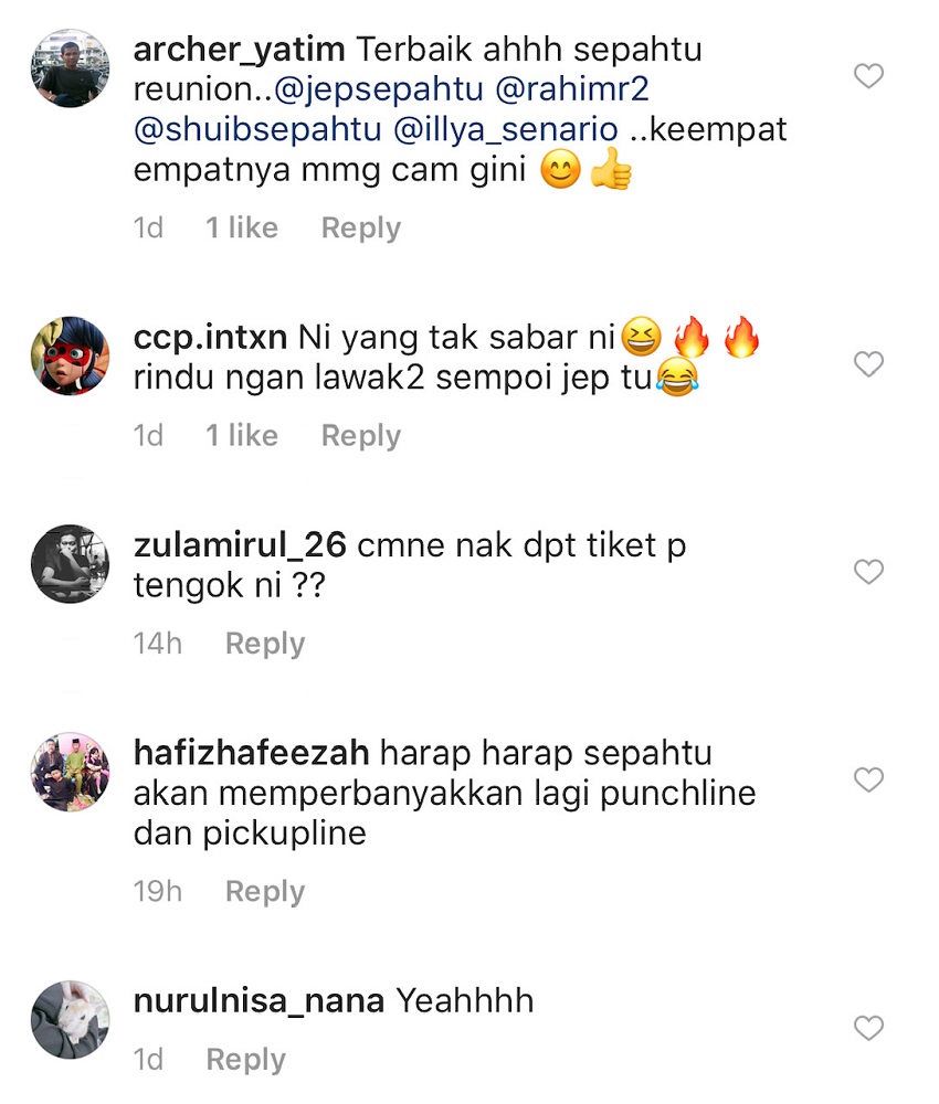 Menerusi pemerhatian di laman Instagram Zon Lawak, rata-rata peminat sudah tidak sabar untuk menyaksikan gelagat Jep, Shuib, Rahim, Illya bersama artis-artis undangan di Sepahtu Reunion Live!