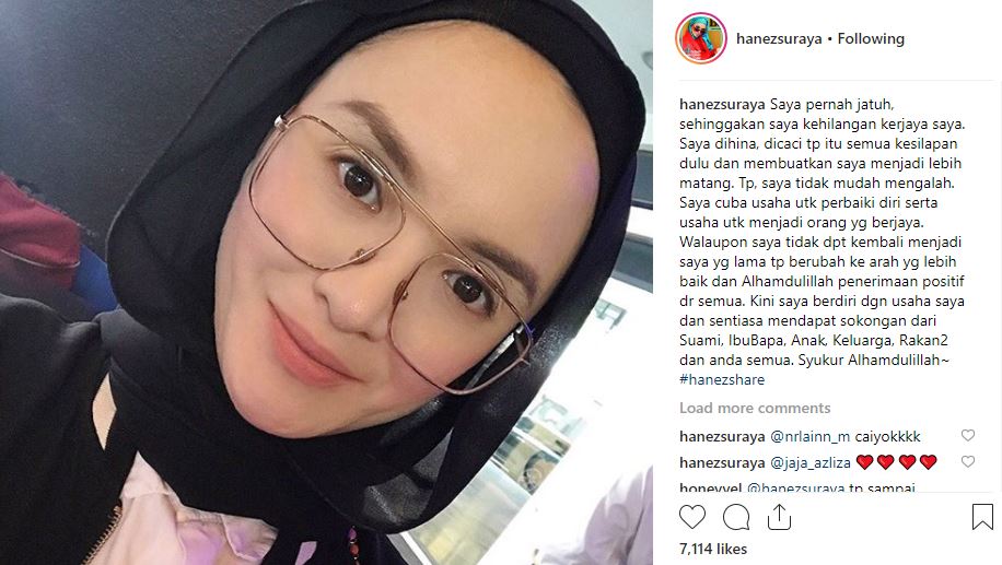 “Kini saya berdiri dengan usaha saya dan sentiasa mendapat sokongan dari suami, ibubapa, anak, keluarga, rakan-rakan dan anda semua. Syukur Alhamdulillah~ #hanezshare,” tulisnya.