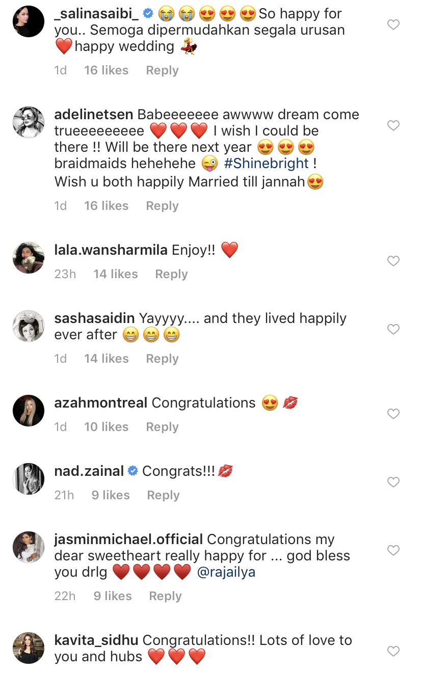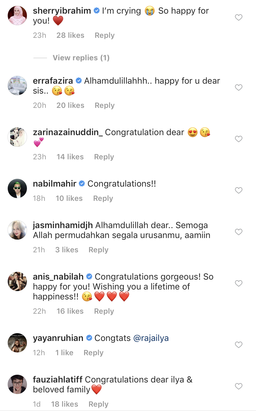 Menerusi ruangan komen rakan artis dan peminat turut menyampaikan ucapan tahniah serta mendoakan kebahagiaan Ilya dan suami.