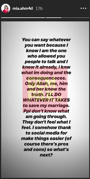Terdahulu, Mia telah memadamkan semua foto suaminya di Instagram selain memuat naik entri seolah-olah memberikan gambaran rumah tangganya bergolak.