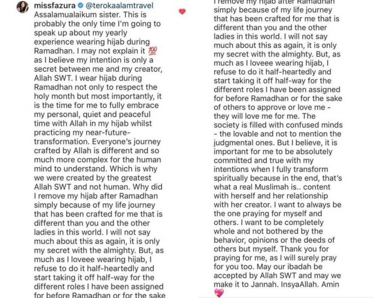 Jelas Fazura lagi, niatnya untuk berhijab di bulan Ramadan bukan hanya untuk menghormati bulan suci itu sahaja, ia kerana mahu melatih dirinya menjadi insan yang lebih baik.