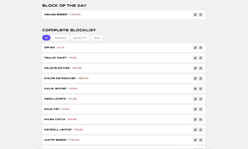 Pengguna media sosial khususnya TikTok mula menghimpun dan berkongsi senarai nama selebriti dan pempengaruh yang mereka dapati langsung tidak menggunakan kelebihan pengaruh mereka untuk menyuarakan tentang nasib golongan yang ditindas di Palestin menerusi 'Operation Blockout'.