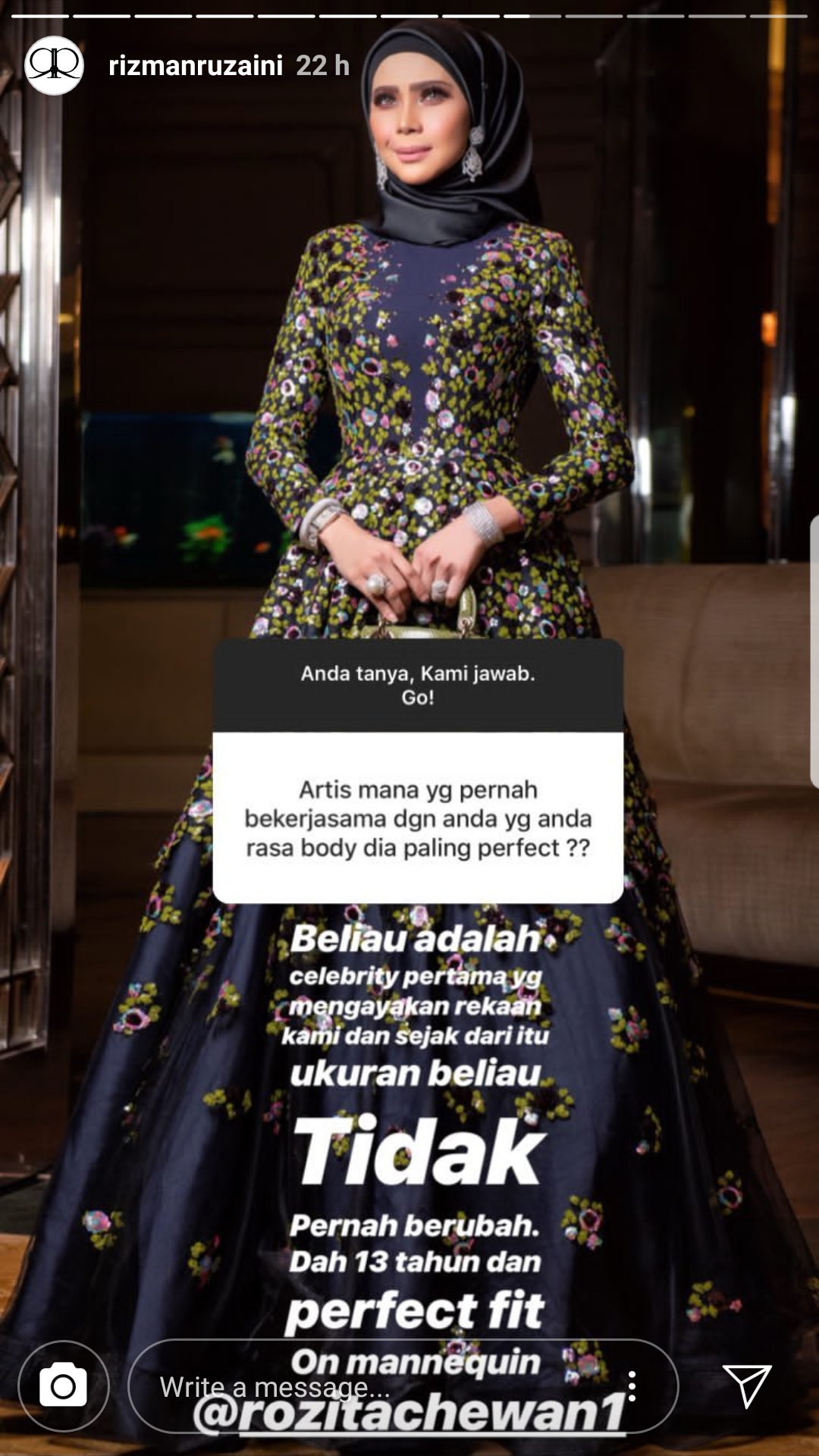 MENERUSI ruangan Ask Me Question di Instagram Stories, pereka fesyen duo pupular Rizman Ruzaini telah mendedahkan bahawa saiz badan pelakon Rozita Che Wan tidak pernah berubah sejak mula memakai rekaan mereka 13 tahun yang lalu.