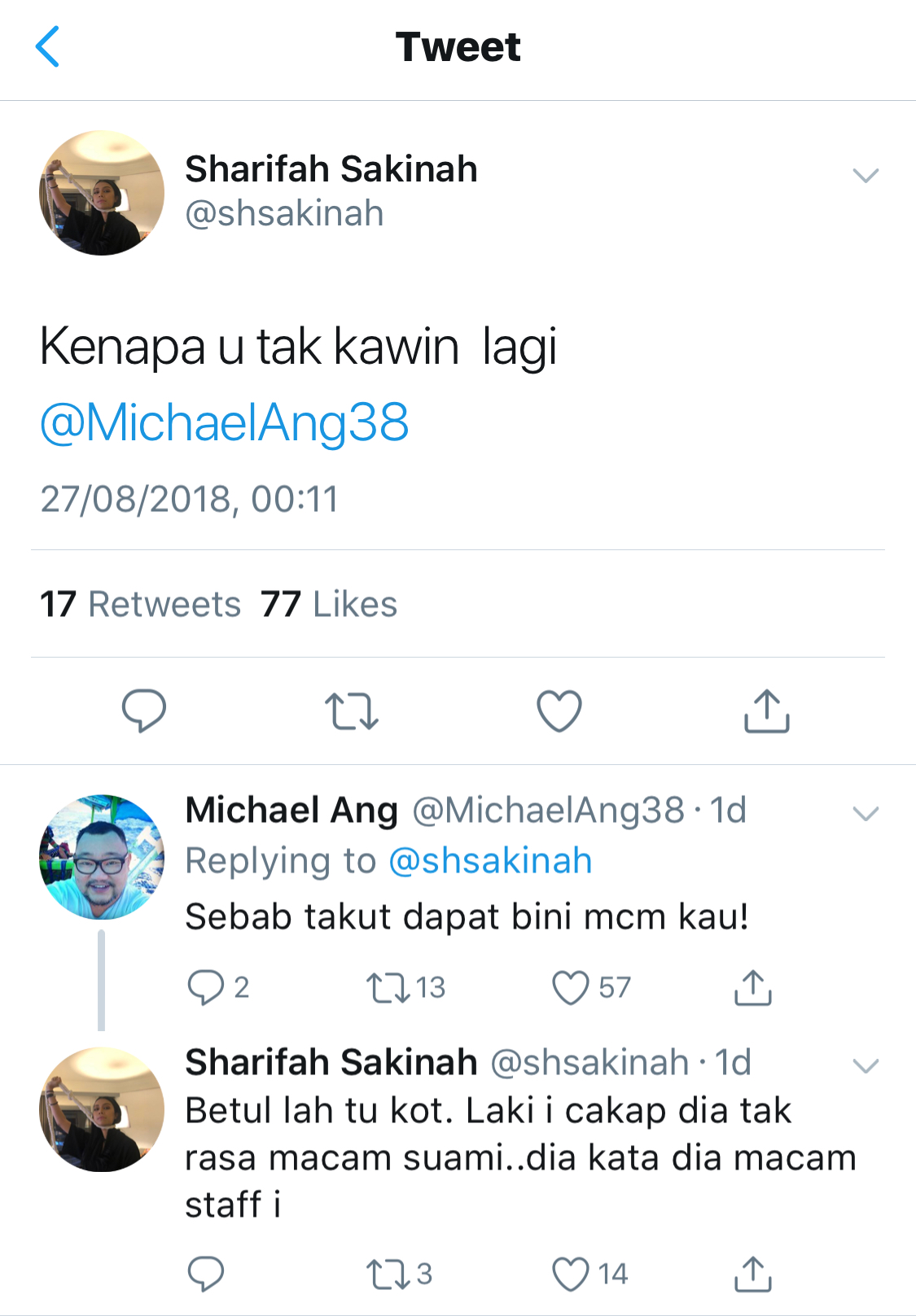 Terbaru, menerusi laman sosial Twitter, Sakinah bertanya kepada Michael mengapa pengarah itu tidak berkahwin lagi.