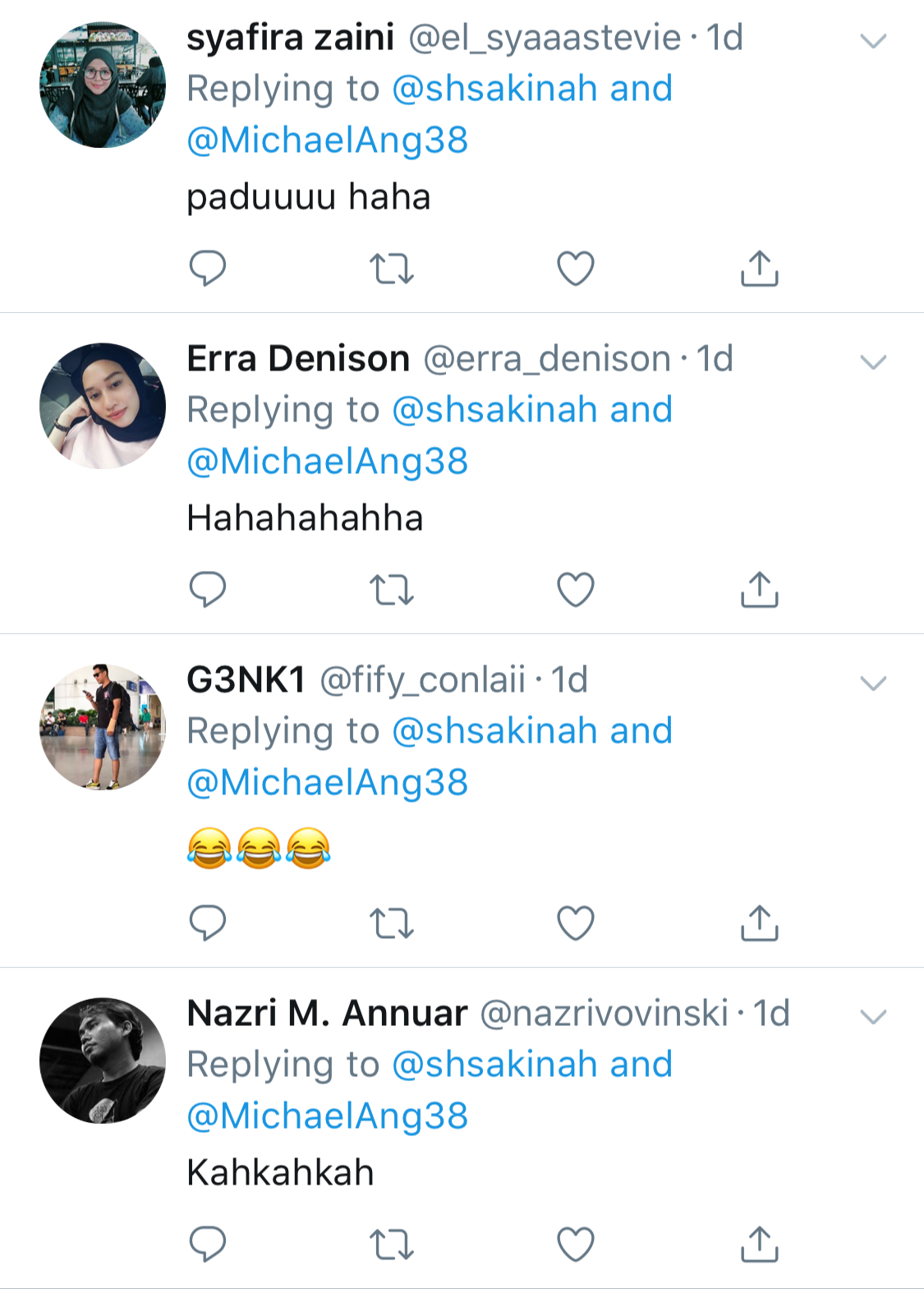 Tidak berdiam diri, Sakinah terus bergurau dan bersetuju dengan respon Michael.