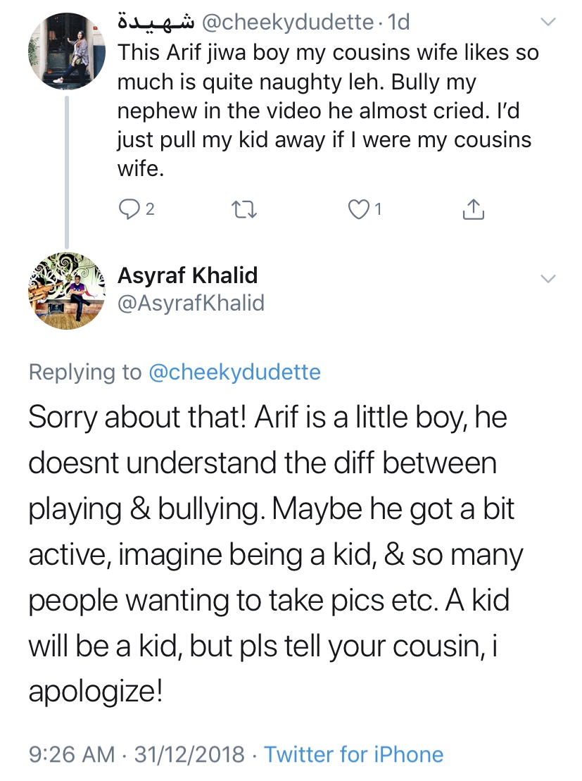 "A kid will be a kid, but pls tell your cousin, I apologize," tulis Asyraf.