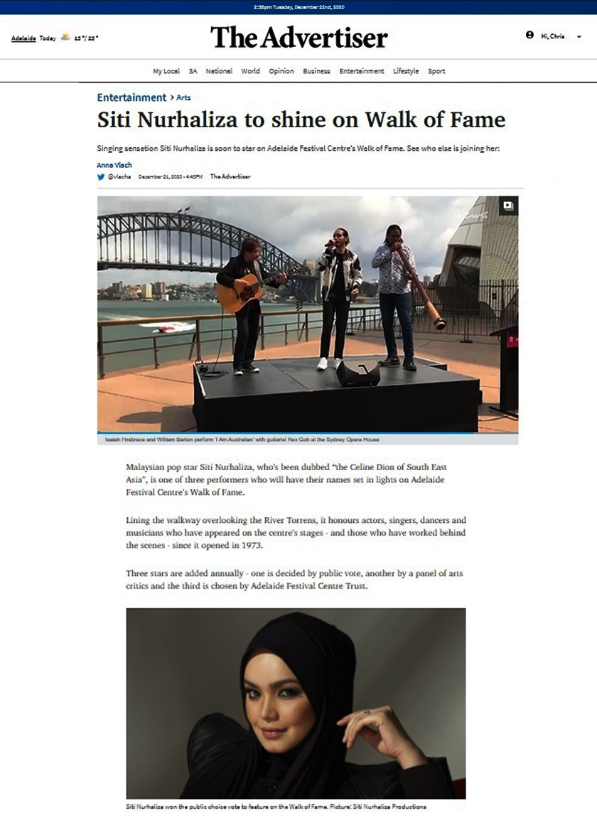“Nanti kalau ke Adelaide lagi, bolehlah saya ambil gambar dengan Walk Of Fame sendiri, tak sangka sebenarnya,” ujar penyanyi kesayangan ramai itu.