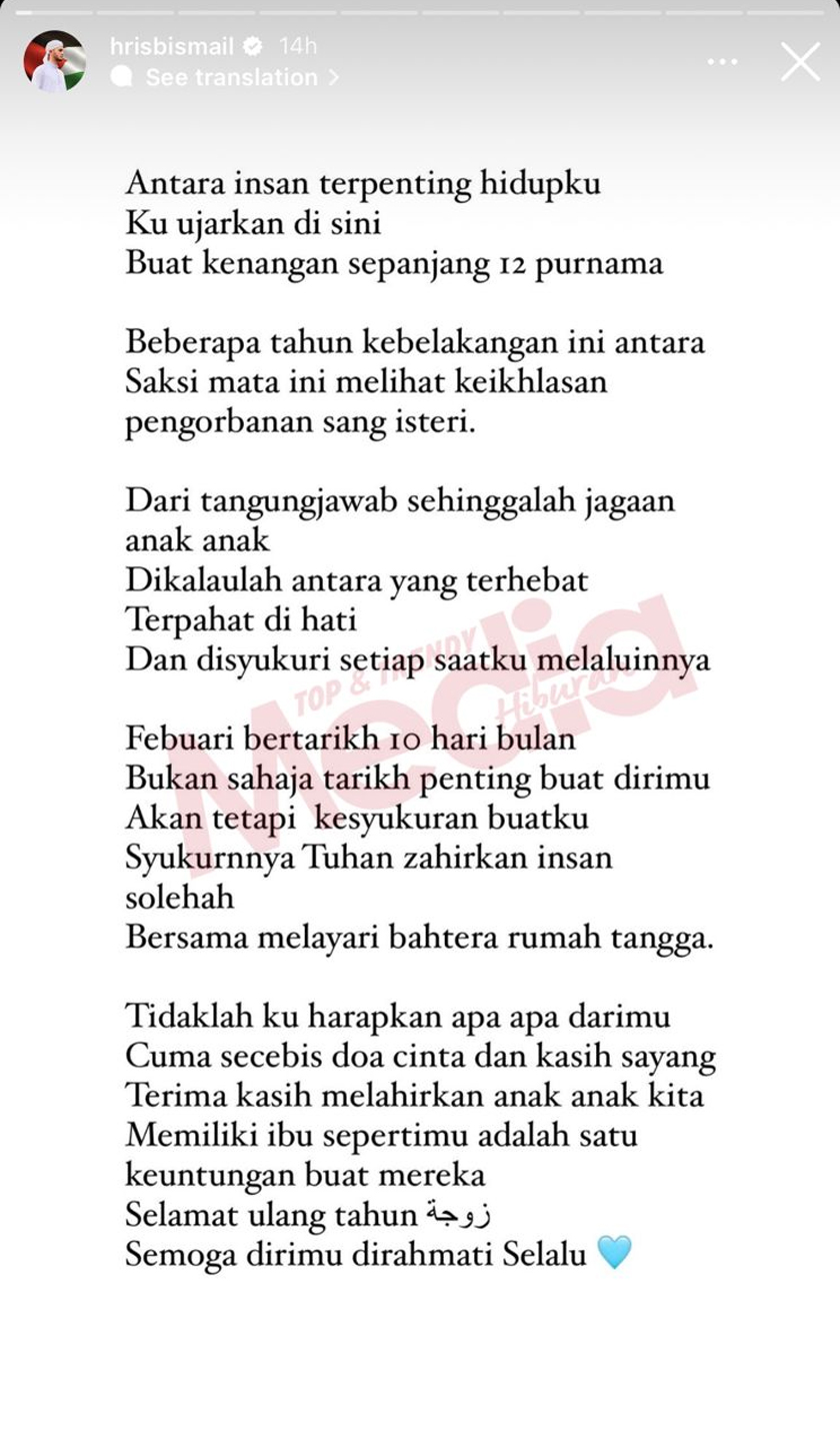 “Daripada tanggungjawab sehinggalah jagaan anak-anak, dikaulah antara yang terhebat terpahat di hati, dan disyukuri setiap saatku melaluinya,” luahnya.
