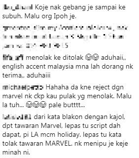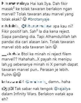 "Dah fikir masak-masak ke tolak tawaran berlakon ngan Marvel? Tolak tawaran atau Marvel yang tolak akak?" tulis salah seorang pengguna.