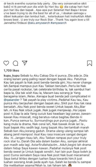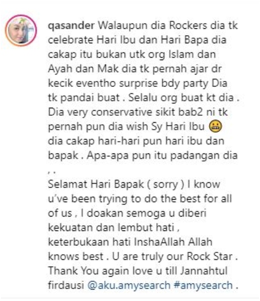 Terdahulu, @qasander telah memuat naik foto suami bersama anak-anaknya dengan kapsyen yang memberitahu walaupun suaminya seorang ‘rockers’, dia tidak pernah menyambut hari ibu atau bapa.