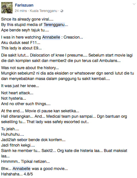 Dalam perkembangan sama, kisah histeria di pawagam Kuala Terengganu itu bukan seperti yang ditularkan sejak malam tadi.