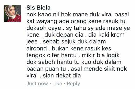 "Saya tahu situasi sebenar yang berlaku sebab saya duduk di barisan hadapan dia. Kaki dia cramp sebab sejuk air condition, bukan kena rasuk," tulis seorang saksi, Sis Biela di Facebooknya.