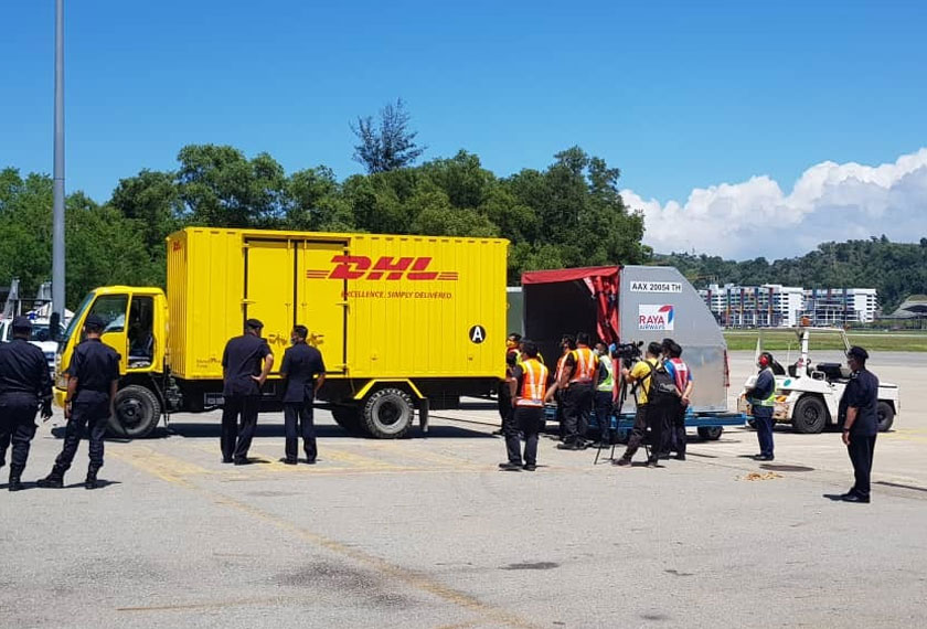 KOTA KINABALU: Kumpulan pertama vaksin Pfizer-BioNtech bagi Sabah selamat tiba dengan pesawat khas di Terminal 2, Lapangan Terbang Antarabangsa Kota Kinabalu (KKIA) pada Khamis.