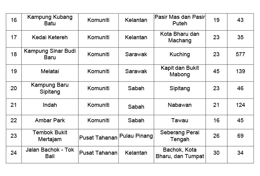 Ketua Pengarah Kesihatan, Tan Sri Dr Noor Hisham berkata, tujuh lagi kluster melibatkan jangkitan dalam komuniti dan dua kluster pusat tahanan di Pulau Pinang dan Kelantan.