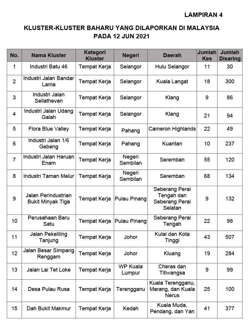 Angka terbaharu itu menjadikan sejumlah 761 kluster aktif setakat ini.