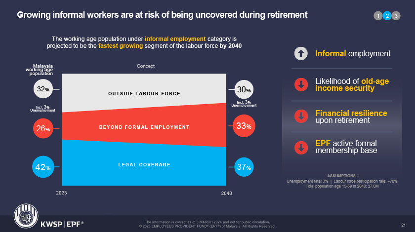 Sementara itu, katanya, pekerja dalam sektor formal pula dijangka menyusut daripada 42 peratus pada 2023 kepada 37 peratus pada 2040.