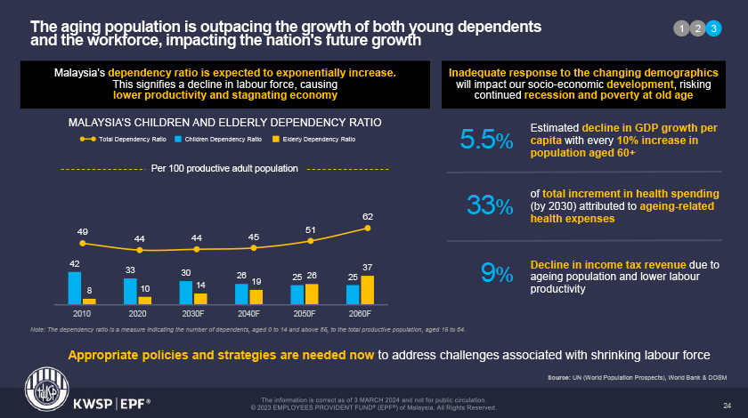 "Pada tahun 2023, nisbah 100 anak kepada ibu bapa adalah 100:44. Ini bermakna 100 orang anak perlu menjaga 44 ibu bapa.