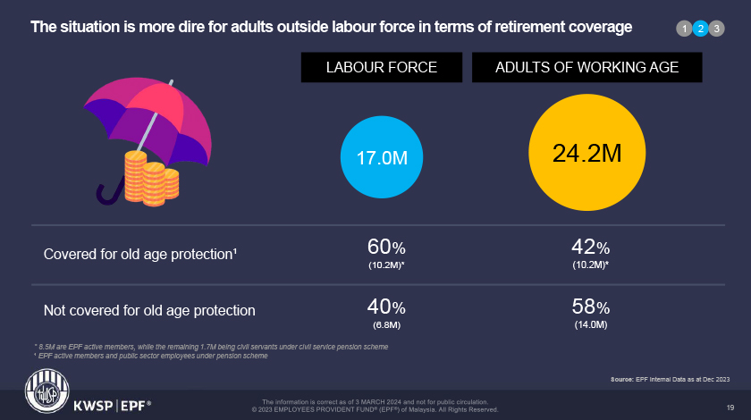 Menurut Ketua Pegawai Eksekutif KWSP Ahmad Zulqarnain Onn, jumlah itu dilihat masih rendah dan membimbangkan berbanding kadar purata liputan global pada 68 peratus.