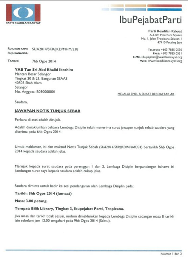 Pada Selasa, Abdul Khalid menerima surat tunjuk sebab gara-gara mengingkari keputusan Mesyuarat Khas Majlis Pimpinan Pusat (MPP) yang memintanya meletak jawatan sebagai MB.