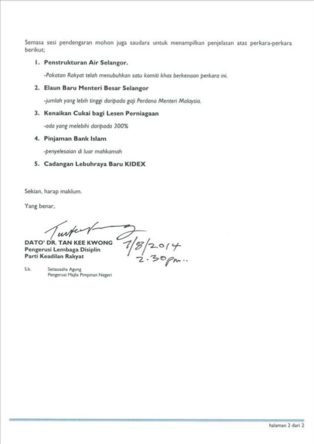 Pengerusi Lembaga Disiplin KEADILAN, Datuk Dr Tan Kee Kwong dalam kenyataannya berkata, Abdul Khalid juga diminta memberi penjelasan mengenai lima perkara iaitu penstrukturan air Selangor, elaun baharu Menteri Besar, kenaikan cukai bagi lesen perniagaan, pinjaman dengan Bank Islam serta cadangan pembinaan projek Lebuhraya Kinrara-Damansara (KIDEX).