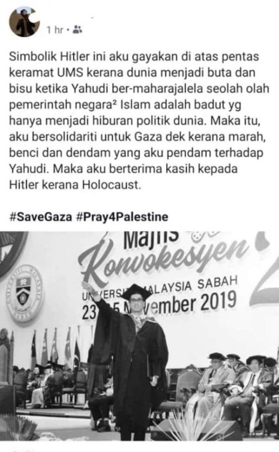 “Maka aku berterima kasih kepada Hitler kerana Holocaust,” kata graduan itu di dalam laman Facebook miliknya.