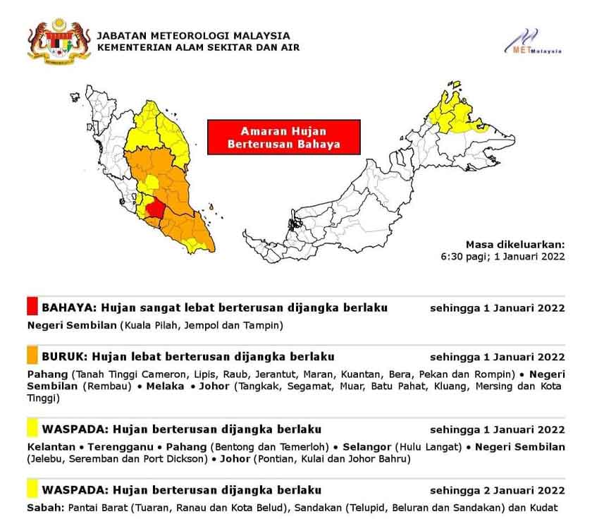 KUALA LUMPUR: Jabatan Meteorologi Malaysia (MetMalaysia) hari ini mengeluarkan amaran hujan berterusan bagi kategori bahaya, buruk dan waspada, susulan hujan lebat dijangka berterusan di kebanyakan kawasan di Semenanjung dan Sabah.