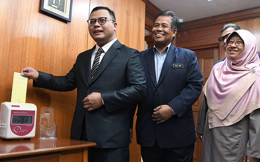 Beliau tiba di Bangunan Setiausaha Kerajaan Negeri di sini kira-kira jam 7.50 pagi sebelum mengetik kad perakam waktu pertamanya sebagai Menteri Besar.