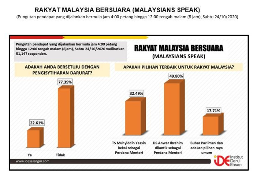 Dapatan tersebut diperoleh menerusi pungutan pendapat bertajuk 'Rakyat Malaysia Bersuara' yang dijalankan IDE secara elektronik bermula jam 4 petang 24 Oktober, 2020, hingga 12 tengah malam tadi.