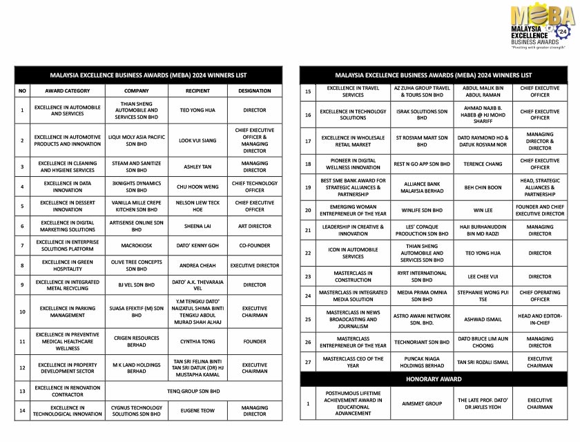 Selaras dengan landskap perniagaan semasa, tema edisi 2024, 'Pivoting with Greater Strength', MEBA mengetengahkan keupayaan strategik perniagaan dalam mencari peluang baharu untuk pertumbuhan dan kelestarian di pasaran yang tidak menentu.