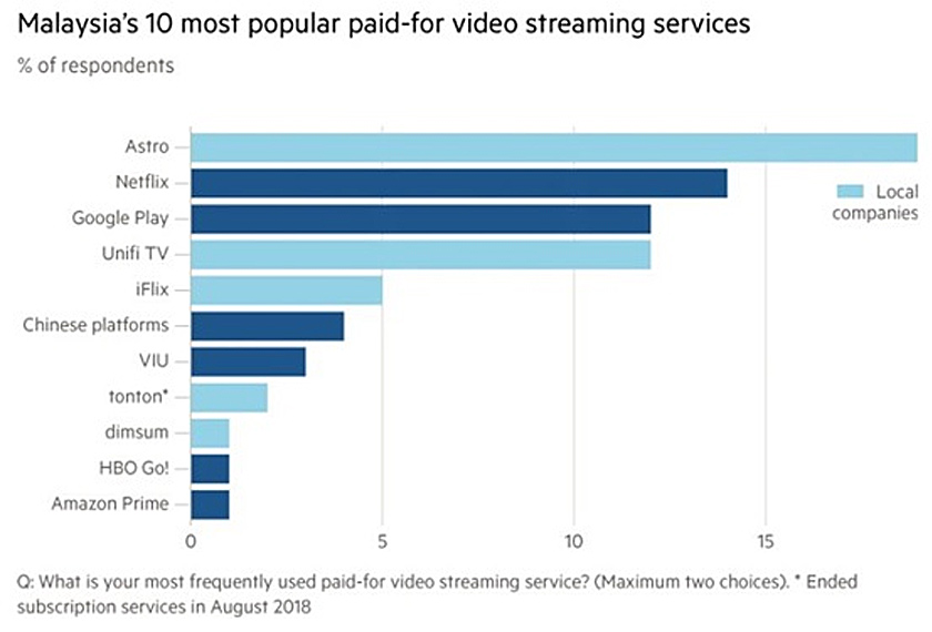 Responden telah ditanya “apakah perkhidmatan penstriman video berbayar yang paling kerap anda gunakan?” sepanjang kaji selidik tersebut dan Astro, sebuah jenama tempatan muncul sebagai pilihan popular sekali gus mengatasi Netflix, Google Play dan Unifi TV.