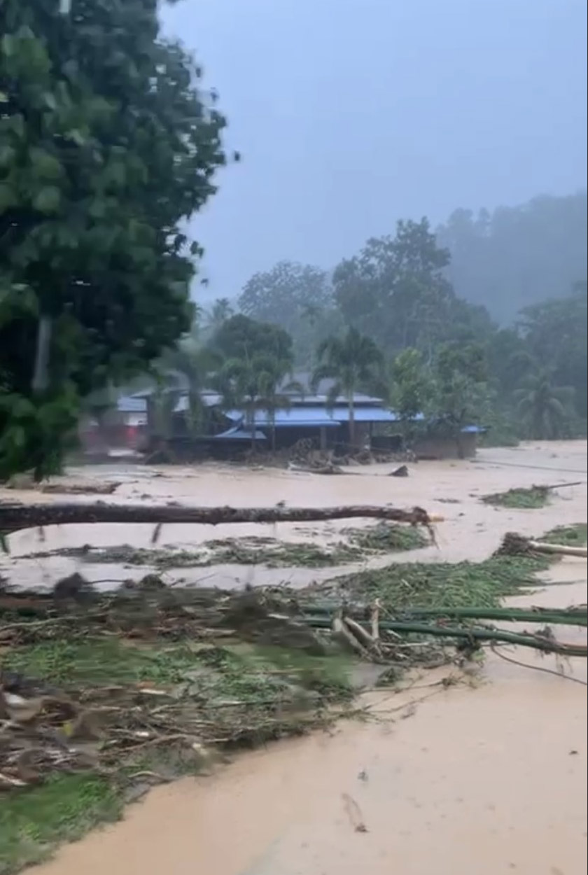 BALING: Hujan lebat hampir tiga jam di daerah Baling menyebabkan paras air Sungai Kupang melimpah memasuki penempatan penduduk yang berdekatan.